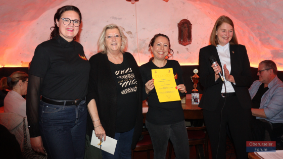 Aline Becker überreichte den Ehrenpreis der Stadtwerke Oberursel in Vertretung von Julia Antonia an den Verein Kunstgriff für ihre Thematisierung des Durchstichs der Nassauer Straße mit dem Motto „Nur Narren wollen ihn noch schnell: Den Orschler Highway to (the) Hell“. Bei diesem Preis handelt es sich um den begehrten “Ohlenspiegel”, der an den “Großer Orscheler Fassenachter” Heinz Ohl (1930-1995) erinnert. Er wird seit 1996 jährlich verliehen und wurde vom Oberurseler Bürger Bernhard Kempermann gestiftet und vom Künstler Hendoc geschnitzt. Der „Ohlenspiegel“ selbst ist etwas größer und befindet sich im Rathaus. Die Plakette wird zum späteren Zeitpunkt angebracht.