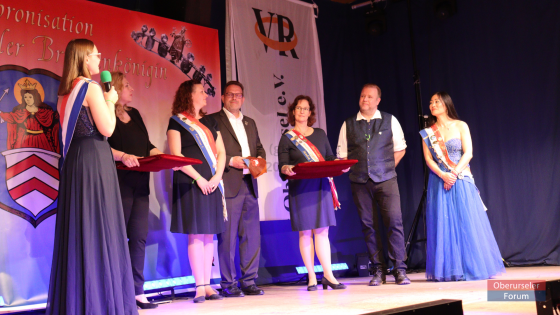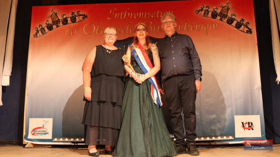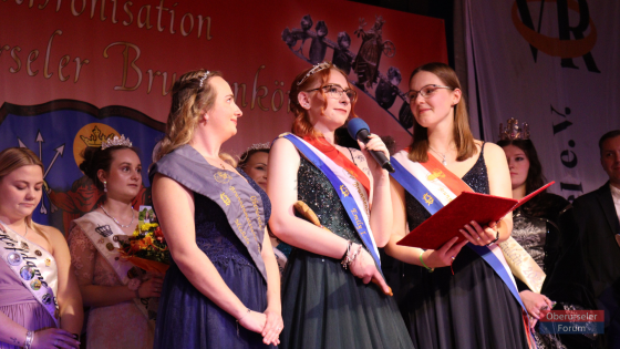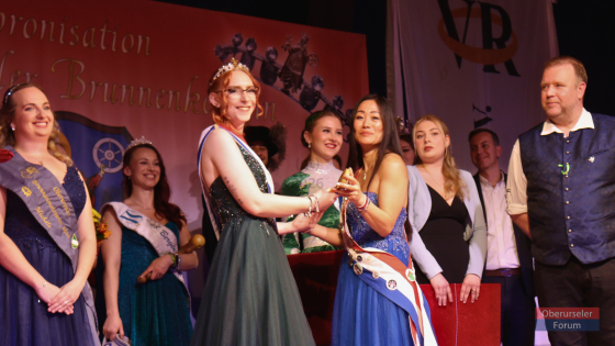 Anschließend kamen Emily und Michèle mit einem großen Knall und goldenem Konfetti in den Saal – Emily in einem dunklen grünen Galakleid und Michèle in einem dunklen blauen Galakleid. Von Bürgermeisterin Antje Runge erhielt Emily zunächst die traditionelle Kette als Geschenk von der Stadt und bekam die Krone von Tanja aufgesetzt. Beide erhielten ihre Schärpen von René – Emily in den traditionellen Tricolore und Michèle in dunkelblau. Beide Schärpen tragen das Frohsinn Wappen. Neu in diesem Jahr war das Diadem für die Brunnenmeisterin. Schließlich überreichte Tanja das Zepter an Emily.